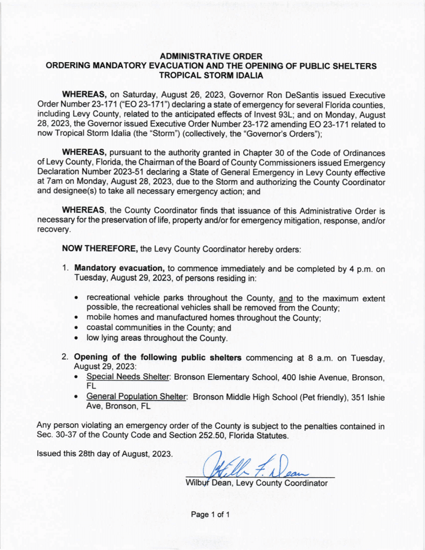 A MANDATORY EVACUATION has been ordered for Levy County residents and visitors in the coastal areas of Levy County. This includes, but is not limited to Cedar Key, Yankeetown, Fowlers Bluff, Fanning Springs, and any other area that is prone to storm surge. Please start your preparations for evacuations as soon as possible, and be completed by 4:00 p.m. Tuesday, August 29, 2023. Residents and visitors of Cedar Key need to be off the island before the storm surge arrives. The bridges throughout the island cannot withstand the storm surge and will become impassable. Once the storm surge comes in, help may not be available to reach you.