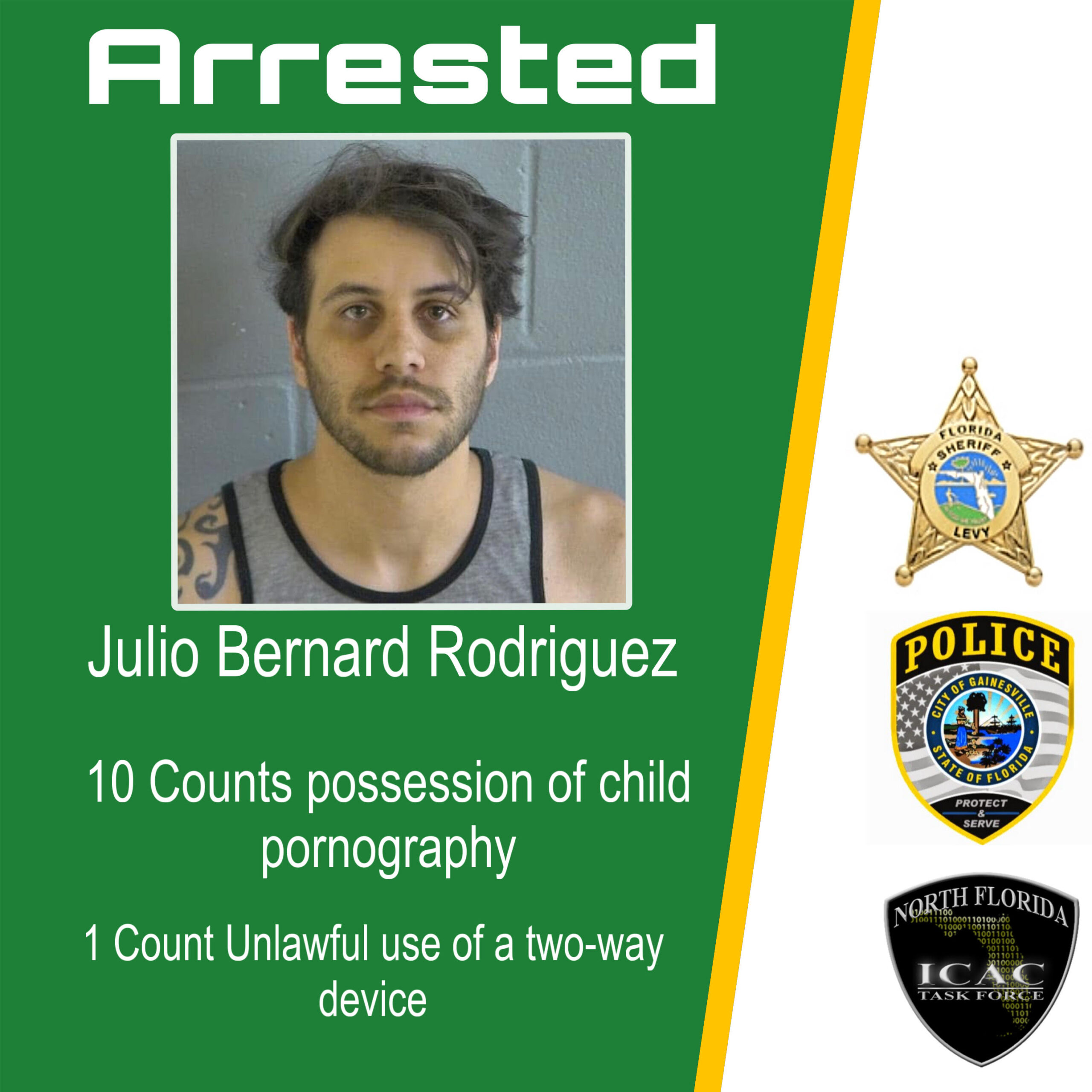 Detectives executed the search and found a computer and cellphone belonging to Rodriguez contained child sexual abuse material. Rodriguez was arrested for 10 counts of possession of child pornography and one count of unlawful use of two-way device. Rodriguez was transported to the Levy County Sheriff’s Office Detention Bureau.