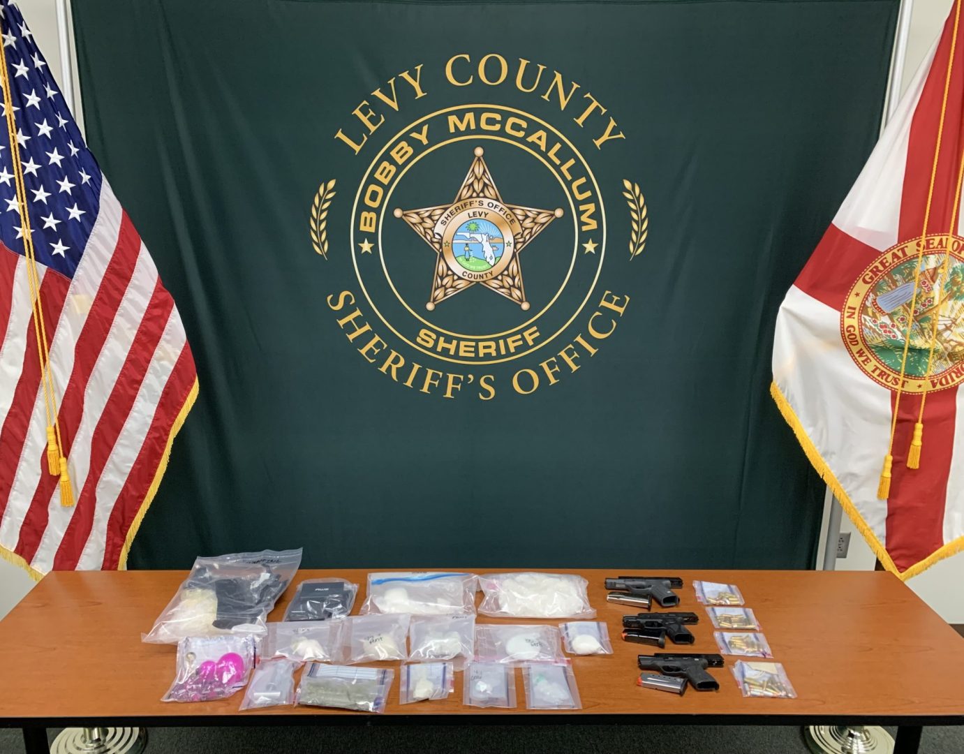 On July 24, 2023 Task Force Detectives executed the search warrant on the truck. Detectives recovered the two plainly visible guns, drugs and money. The search also led to the discovery of a third gun and more narcotics. In all, three guns, one having previously being reported stolen in Levy County on 3/9/23, 278.7 grams of Fentanyl (0.61 pounds), 580.1 grams of methamphetamines (1.27 pounds), 57.5 grams of powder cocaine, 20.8 grams of crack cocaine, 2.9 grams of MDMD ecstasy, 26.7 grams of marijuana, 5 packs of Fentanyl 12mcg/hr patches, oxycodone and $1,600 in US currency. In the State of Florida possession of more than 400 grams of methamphetamines is considered a trafficking offense and is punishable as a Capital Felony with a potential life sentence and possession of Fentanyl in excess of 28 grams carries a minimum mandatory sentence of 25 years.